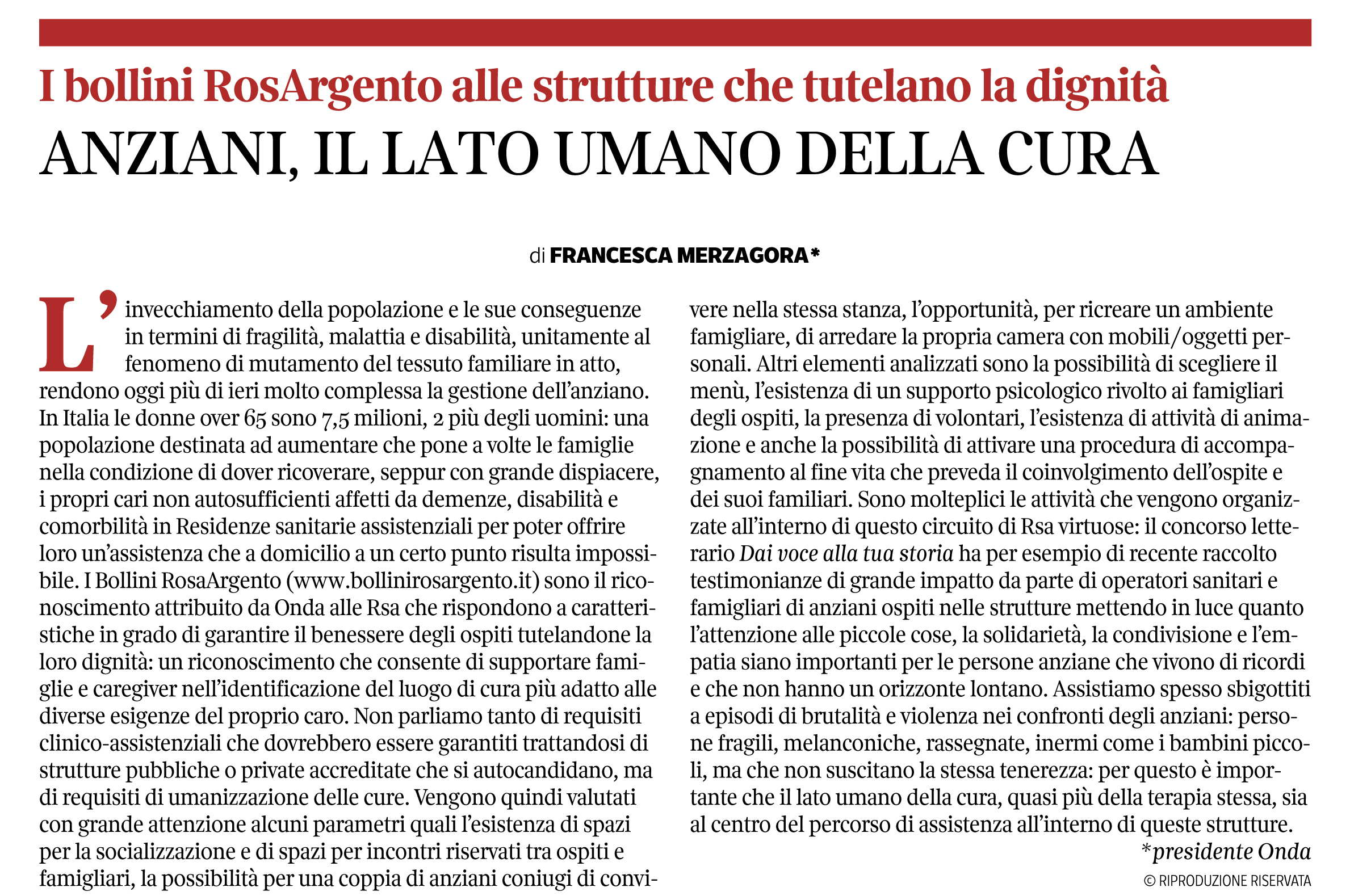 I Bollini RosaArgento (www.bollinirosargento.it) sono il riconoscimento attribuito da Onda alle Rsa che rispondono a caratteristiche in grado di garantire il benessere degli ospiti tutelandone la loro dignità: un riconoscimento che consente di supportare famiglie e caregiver nell’identificazione del luogo di cura più adatto alle diverse esigenze del proprio caro. Non parliamo tanto di requisiti clinico-assistenziali che dovrebbero essere garantiti trattandosi di strutture pubbliche o private accreditate che si autocandidano, ma di requisiti di umanizzazione delle cure. Vengono quindi valutati con grande attenzione alcuni parametri quali l’esistenza di spazi per la socializzazione e di spazi per incontri riservati tra ospiti e famigliari, la possibilità per una coppia di anziani coniugi di convivere nella stessa stanza, l’opportunità, per ricreare un ambiente famigliare, di arredare la propria camera con mobili/oggetti personali.