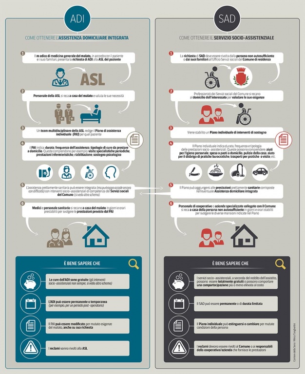 Racconta il figlio di una signora di 89 anni che vive nelle Marche: «Mia madre è invalida al 100 per cento, perché è cardiopatica, soffre di Alzheimer e di diabete e ha un’insufficienza renale grave. Abbiamo attivato l’Assistenza domiciliare integrata (Adi), che, oltre alle visite a casa di medico di famiglia e infermiere, prevede l’intervento di specialisti come il cardiologo, il geriatra, il neurologo. Ma alla Asl mi hanno detto che non hanno specialisti che facciano visite a domicilio, quindi, per i controlli, mia madre deve andare in ospedale e ogni volta bisogna pagare un’ambulanza per trasportarla. Nemmeno il geriatra prende in carico il malato: fa la visita a casa soltanto quando occorre stabilire se è necessario o meno portarla in una Residenza sanitaria assistenziale (Rsa)».