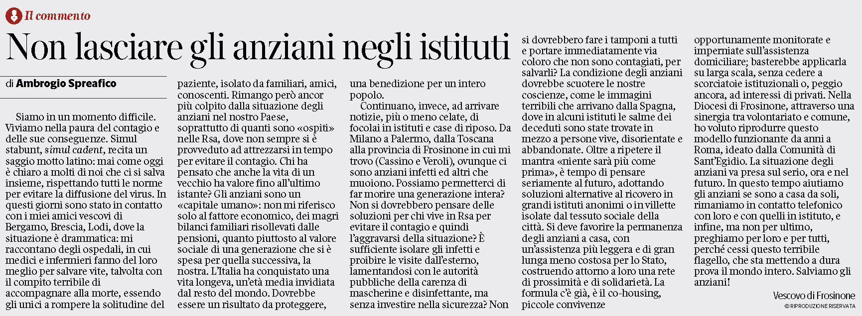 In questo articolo tramite le parole del Vescovo di Frosinone si mette in luce questa ‘emergenza nell’emergenza’ ponendo l’attenzione sull’importanza di non lasciare soli gli anziani e di prendere sul serio la loro situazione, ora e nel futuro, oltre che di adottare soluzioni e formule alternative di presa in carico, ad esempio il co-housing, per garantire una maggiore sicurezza della loro salute.’
